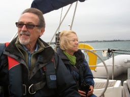 Rendez-vous with Wendy and Kevin having been safely accomplished on Tuesday 17th in Vannes, we set off down river towards Ile aux Moines for overnight stop. Despite showers and high winds we persevered and 2 hours later were berthed on a pontoon detached from the land. Hardly an ideal introduction to sailing ... but stroll ashore in sunshine the following morning made up for it. Acquiring croissants and baguette en route, embarkation followed just before midday. Once again, the skipper demonstrated how to stroke the under-water surface with the keel as we left (well, it was low tide and it was still very windy - in the wrong direction) but fortunately Follyfin sustained no serious damage. Now we were bound across the Gulf of Morbihan and then up-stream to Auray on the river of the same name